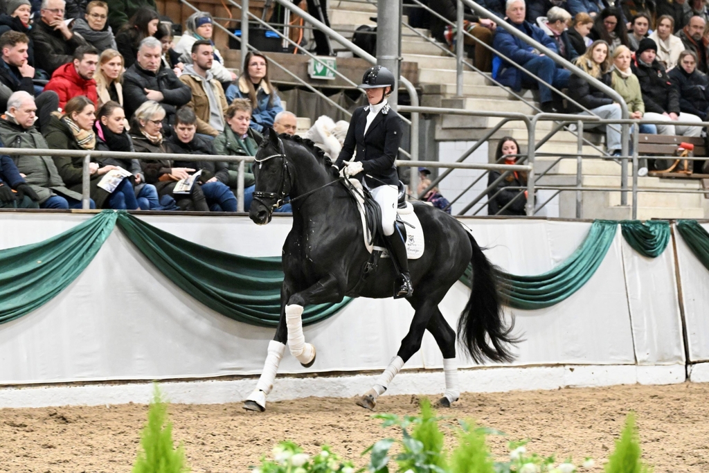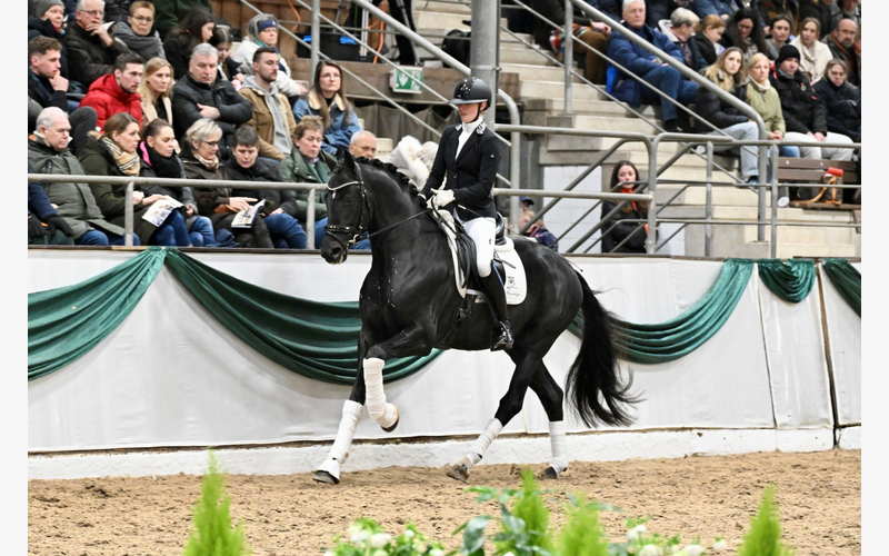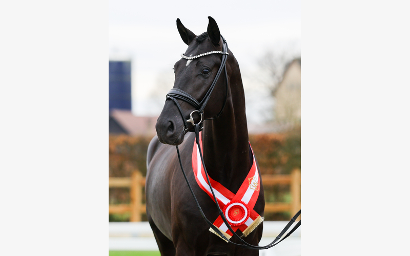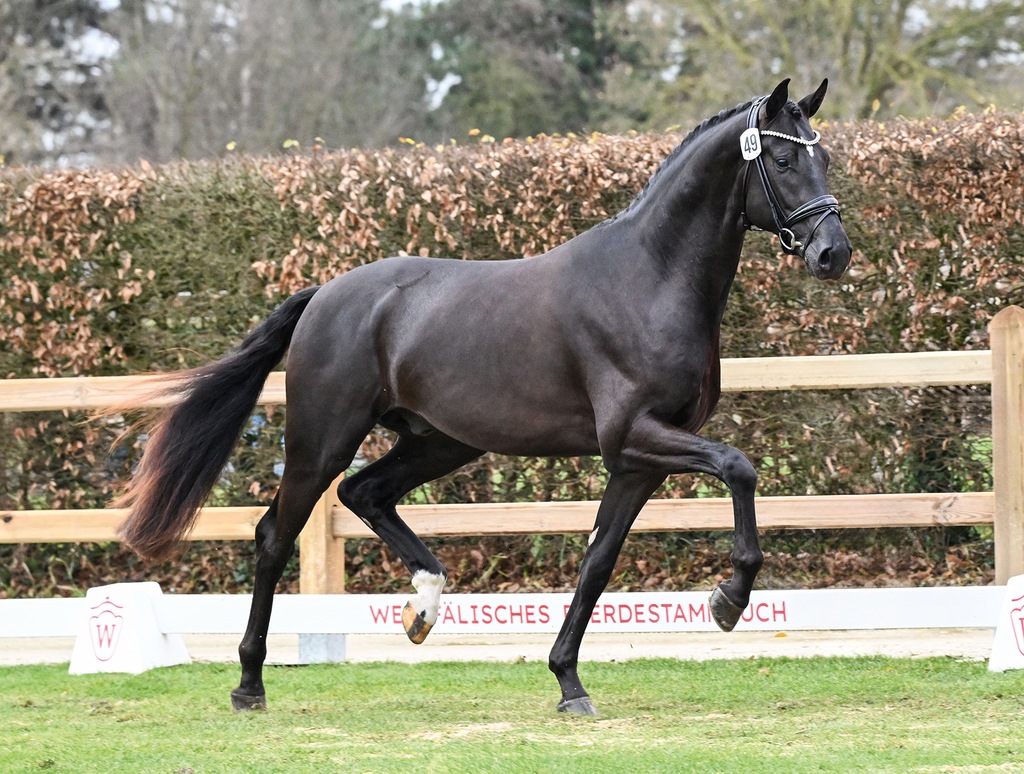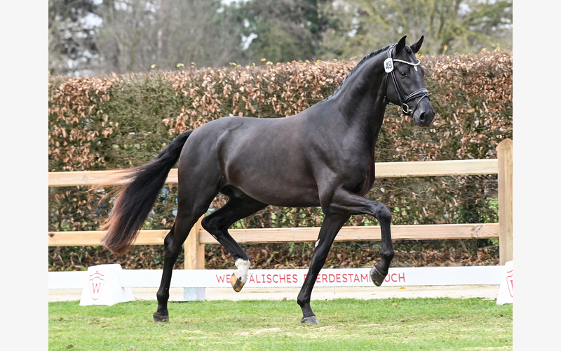 Ein wahrer Siegerhengst: kraftvoll, raumgreifend mit elastischen Bewegungen besticht dieser großlinige Hengst in bildschöner, schwarzer Aufmachung.